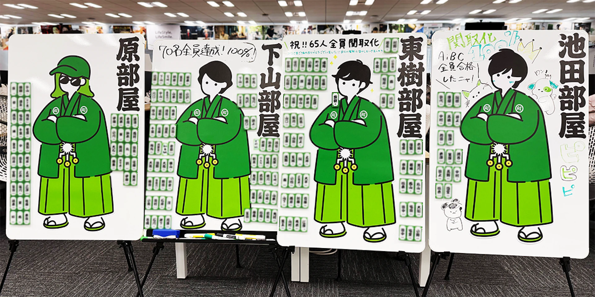浸透のための最大の仕掛けが、オフィスの真ん中に設置された巨大なアナログ掲示板。200人全員の「木札」を用意し、目標(関取)を達成するごとに合格者の木札を貼り出していきました。