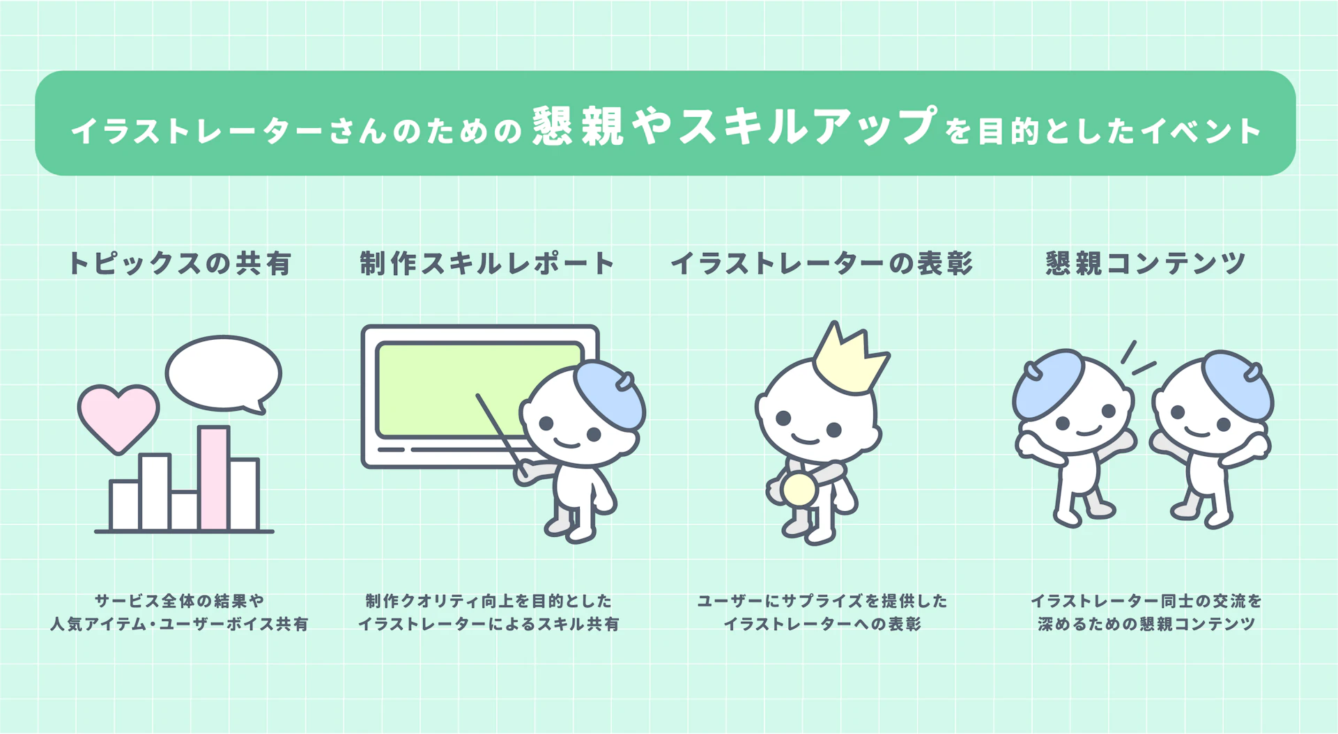 ピグでは、ユーザーにサプライズを提供してくださったイラストレーターさんへの表彰を行なっています。優秀賞・最優秀賞以外にも、ジャンプアップ賞、新開拓賞、キャラクター賞、世界観賞、トップアップ賞といった様々な視点の賞を設けています。
