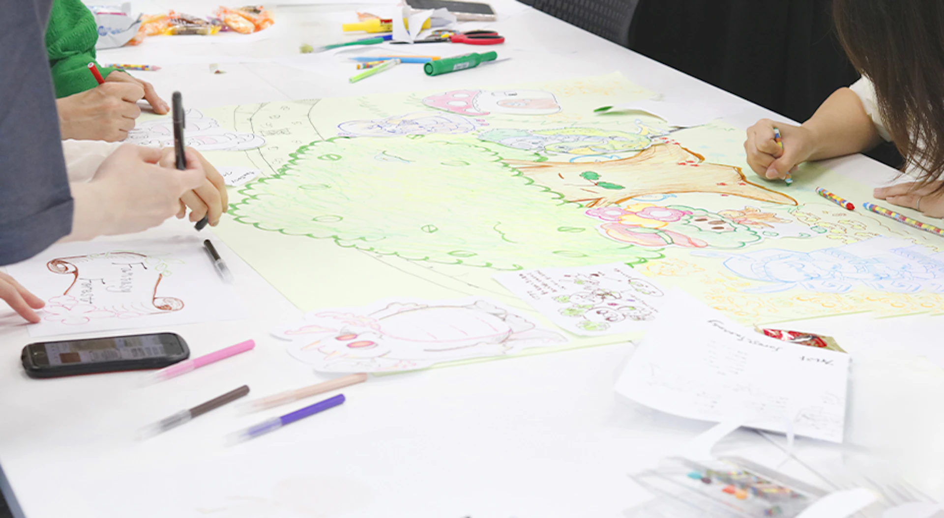 いつもデジタルでアイテムを書いていますが、今回はグループ内で話し合いながら自由に手を動かして制作できるよう、模造紙に描いてもらいました!