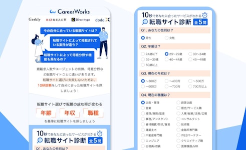 「Career Works」(以下、当サイト)は、転職サイトの比較メディアです。ひと口に転職サイトといっても、掲載されている案件や得意業種、機能は異なります。当サイトでは、それらを比較、検討し、自分に合った転職サイトへの登録に進んでいただけるお手伝いをしています。